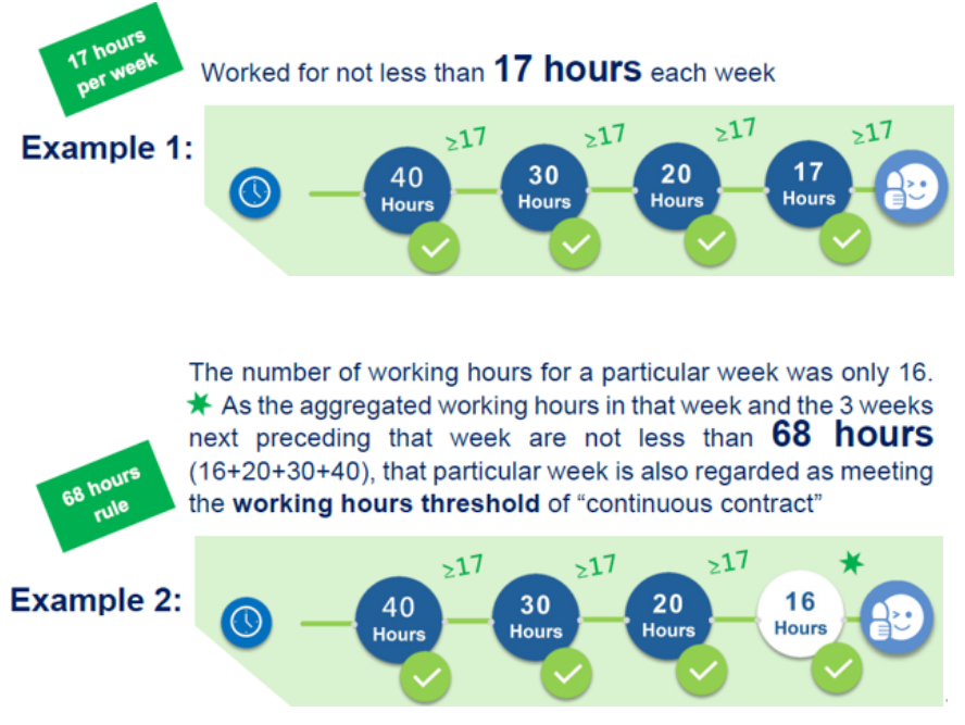 The new “continuous contract” requirement will become applicable starting from 18 January 2026. Under the new requirement, the weekly working hours threshold are lowered to 17 hours. An alternative criterion of using the aggregate working hours for 68 hours or more in a specified four-week period is also introduced. An employee is regarded as being employed under a “continuous contract” if the following criteria are met :
